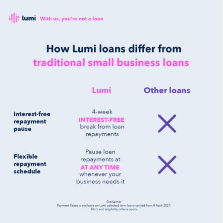 So, whether youâre looking to scale your business or you simply need a break from your loan repayments, a Lumi loan is financial support on your terms thanks to Payment Pause.